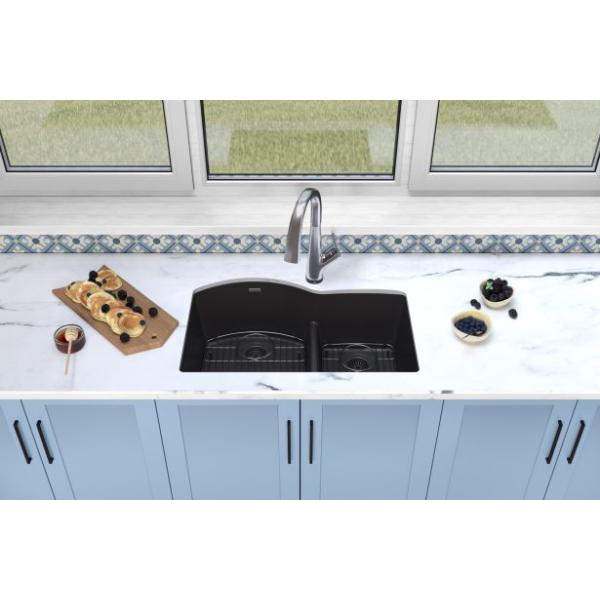 Artfully crafted from a proprietary combination of natural and synthetic materials. This single bowl kitchen sink complements kitchens with contemporary style. Employing the latest technology in design and performance, the granite composite kitchen sink is manufactured with care to ensure superior craftsmanship and enduring performance over time. The sleek sink design features thru-body color and smooth texture to create a modern kitchen sink that makes a statement in sophisticated spaces. Sold as an all-in-one kit, the package includes a sink, drain assembly, basket strainer, polished chrome stainless steel faucet, and soap dispenser.